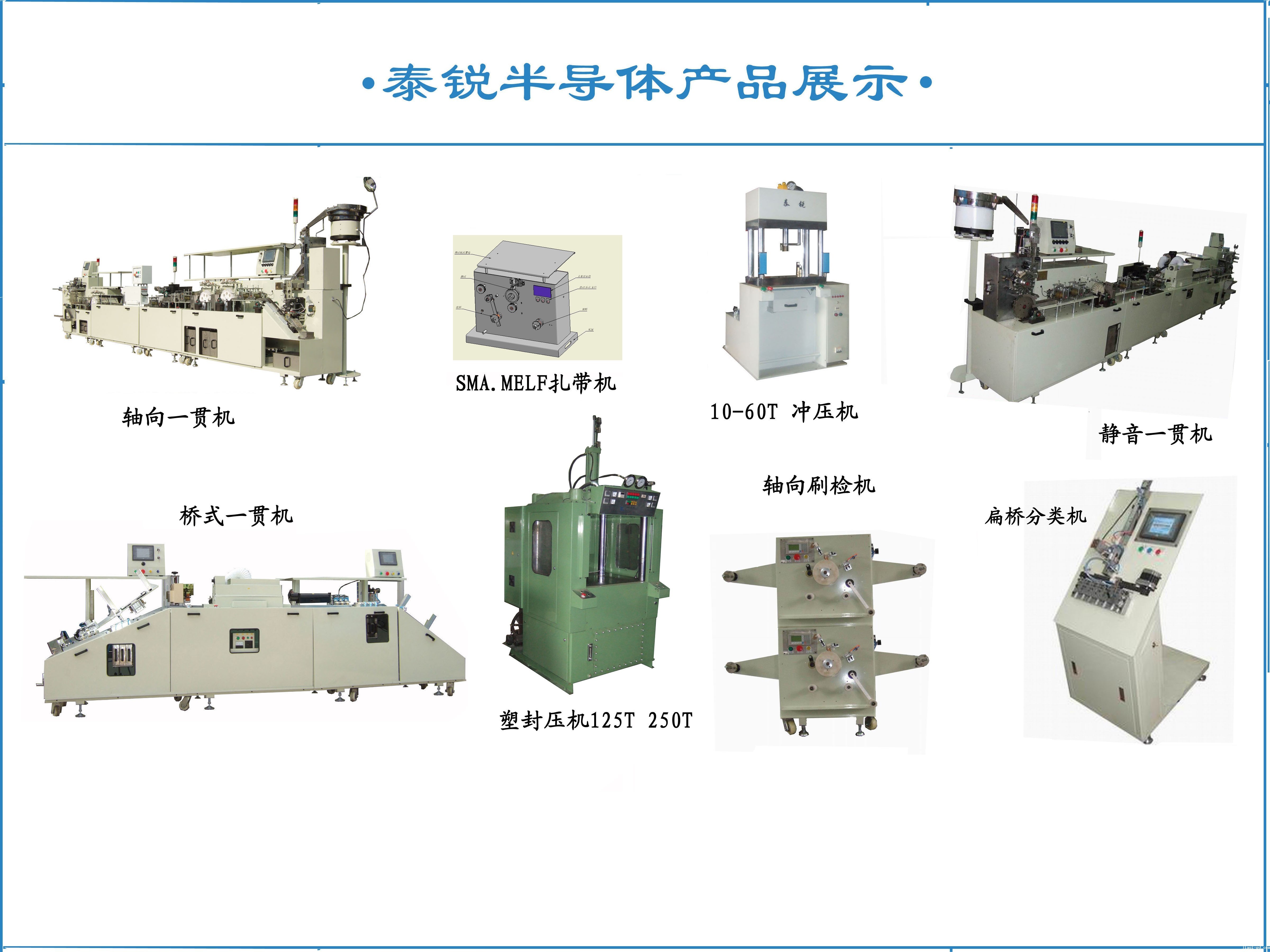 主要产品:全自动切筋成型机TRIM&RORM、175吨塑封压机、75吨打扁机、节能型UV、250吨伺服型塑封压机、电子元器件、高低压电控柜等